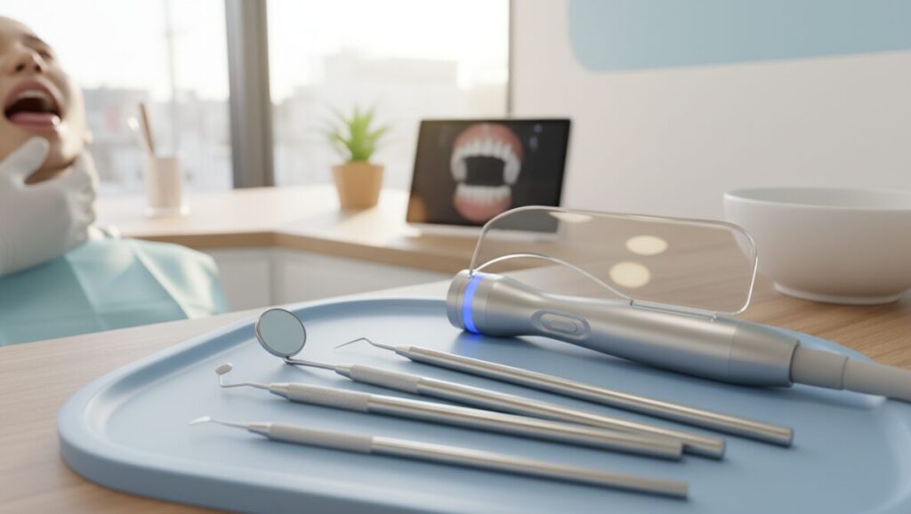 虫歯や歯周病のリスクが高まるので、丁寧な歯磨きが大切です。歯ブラシだけでなく、歯間ブラシやタフトブラシ、デンタルフロスなどの補助的な器具を使用して、装置の周りもしっかりと磨きましょう。